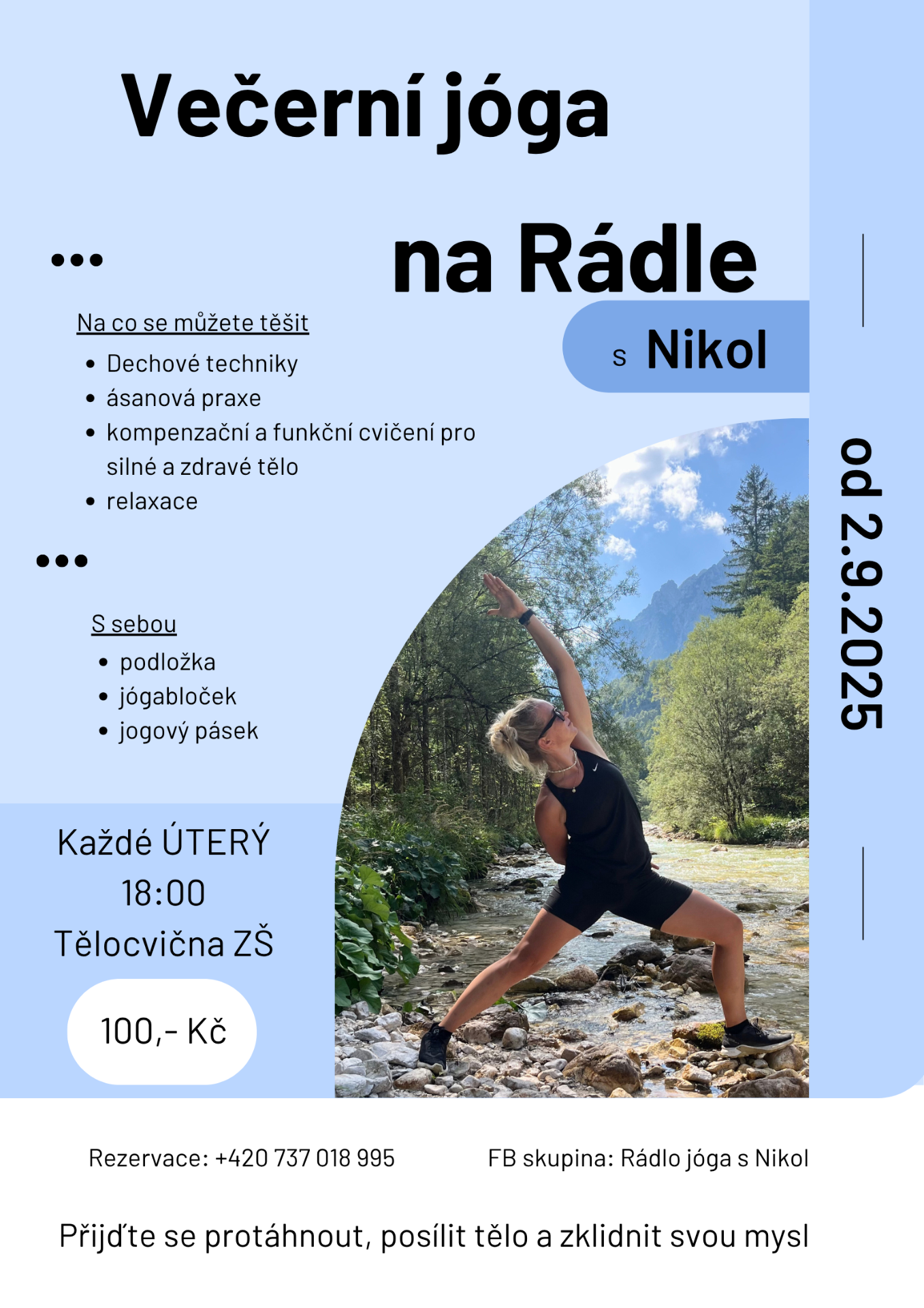 Každé úterý od 18:00 probíhá veřejná lekce jógy v tělocvičně ZŠ Rádlo. Lekce jsou vhodné pro všechny a jsou zaměřené na celkovou kompenzaci těla. Lekce obsahuje dechové techniky, ásanovou část a relaxační část.
